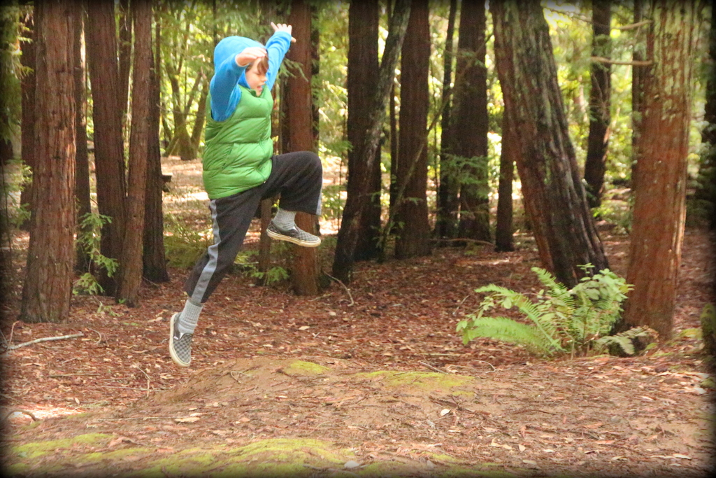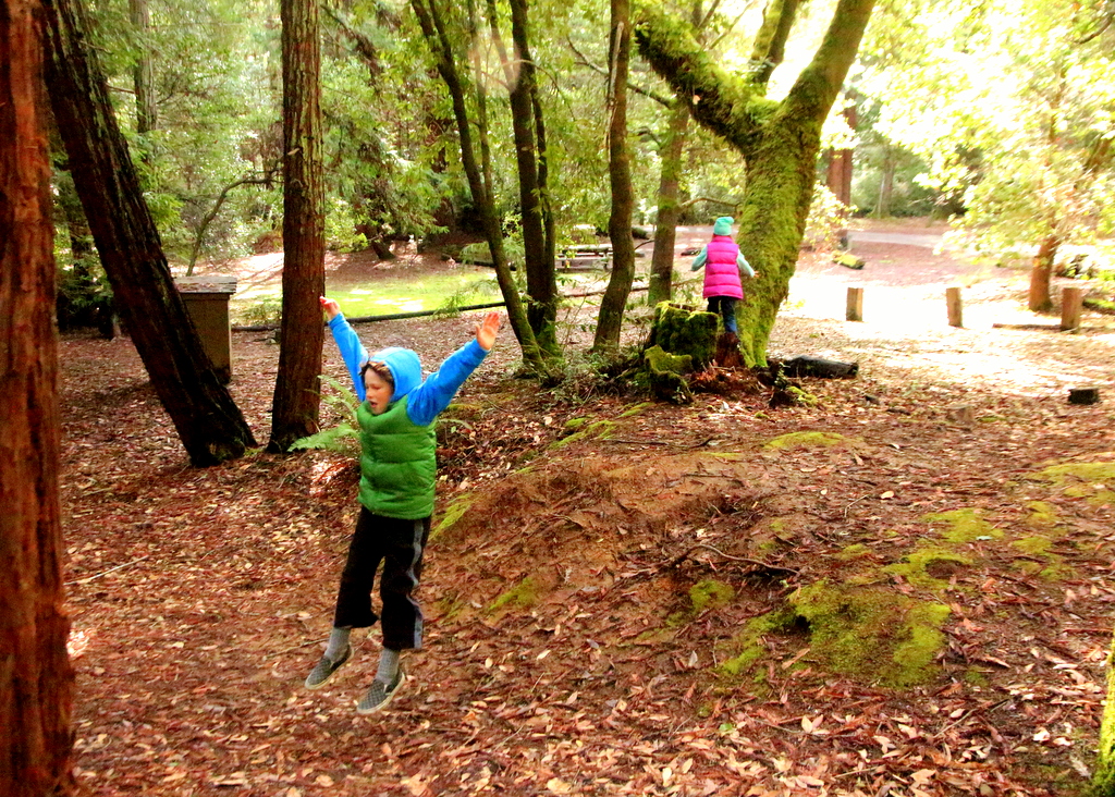 We arrived at the park at 5pm. The ranger station was empty, visitor station closed, and no camp host. There was only one other camping family staying in one of the little cottages. We got the low down; ranger was out sick, visitor station closed for the week, notes on the camp host board about how to check in, and the showers worked; 4 quarters would buy you 5 minutes of hot water. The only other family in the park was leaving in the morning. We were a little unsettled about being the only ones camping all alone in the beautiful forest but decided it would be okay. We stayed on the Azalea loop right across from the newest bathroom. The other camping loop was closed due to the fact that most people did not camp in winter in forests. We had no reservations, just picked a site and paid cash for our spot and then took the dog for a walk and checked out the campground. The campgrounds are lovely. The roads are wide and newly paved and the trees provide nice cover in summer weather. The sites are a nice size and fairly level for CA with a table and fire ring. The trees are covered with moss and there are a few redwoods spread throughout. An owl swooped right over head and even Lady was quiet in awe. There were 2 bathrooms and plenty of great sites but in February it was cold, the kind that seeps right into your bones. We headed back to the trailer and discovered our electric was dead which meant our refrig. was gone too. Salvaged what we could for dinner, propane was working and we had camping lanterns. The kids loved it. Eating by lanterns, just like tent camping. We got ready for bed but it was already so cold in the trailer. We made up one bed for the kids for warmth and had them in ski jackets and hats with as many blankets as we could. Hubby and I did the same with Lady snuggling between us. Even she was cold.