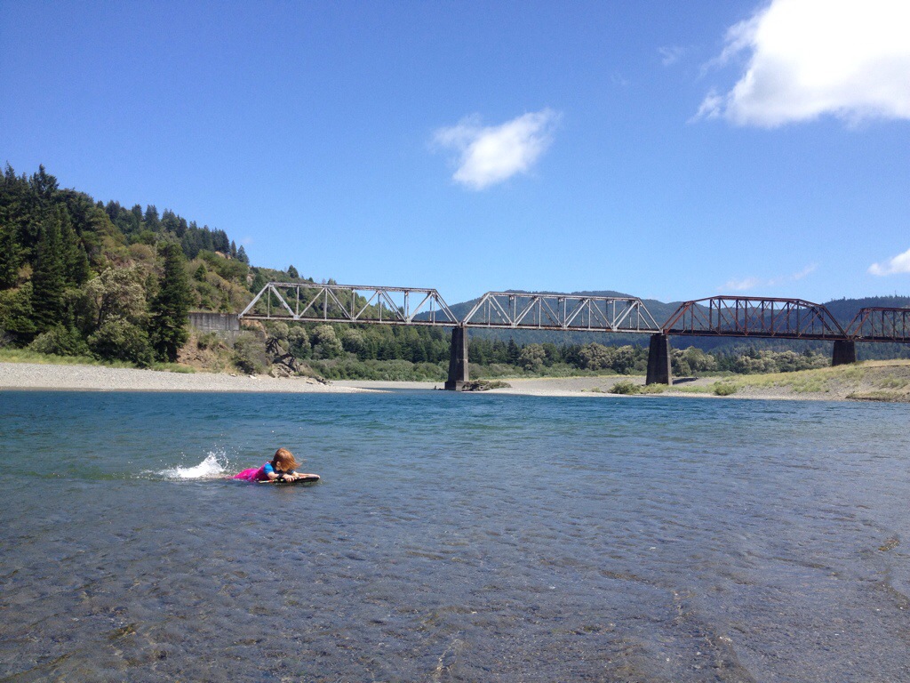 Running along the Avenue of the Giants is the Eel River. Its lovely waters snaking in and out of the cover of the forest seduced us to find access to its shores. We found an off road access point right next to the Dyerville picnic spot. (Dyerville was named for the town that once existed here. The beginning of it’s demise was due to the protection of the local redwood forests from logging in the 1920’s. The rest of the small town was wiped out later by a flood.)